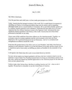 Бајден је у писму на платформи Икс поручио да верује да је у најбољем интересу његове странке и државе да се повуче и да се фокусира само на испуњавање своје дужности као председника до краја мандата.