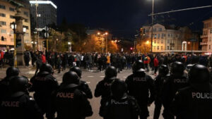 Око 15.20 дошло је до туче 350 демонстраната и полиције. Употребљен је бибер спреј, а три особе су повређене.